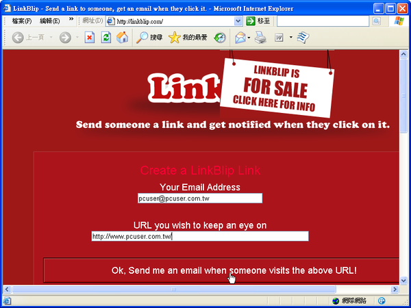 進入LinkBlip網站,在「Your Email Address」輸入你的信箱,在「URL you wish to keep an eye on」輸入你想追蹤的網址,按下下方的〔OK〕。
