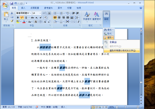6.最後,從【常用】索引標籤中,點選右方的【選取】→【選取所有類似格式的文字】選項,就能選取所有類似格式的文字了。