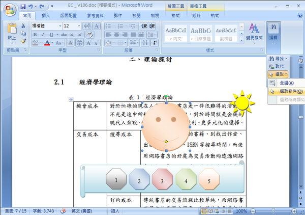2.幸運的話,可以在點選「物件」的情況下,將該「物件」設定為【格式】→【文繞圖】→【文字在後】的配置方式,完全避免「物件」藏在文字後面的困擾。