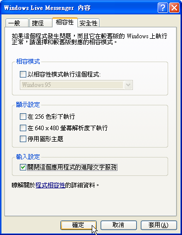 其實方法很簡單,先找到Windows Live Messenger的程式或啟動捷徑,然後在上面點擊滑鼠右鍵,於選單中選擇【內容】,接著切換到〔相容性〕標籤分頁,勾選「關閉這個應用程式的進階文字服務」,就可以用新注音輸入法順利的在新版即時通上打字了。
