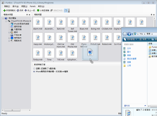 將iPhone與電腦連線,然後開啟iFunBox(http://www.i-funbox.com/ )。接著找到系統內的鈴聲資料夾(/Library/Ringtones),將想要放入的鈴聲用拖曳的方式移到資料夾。