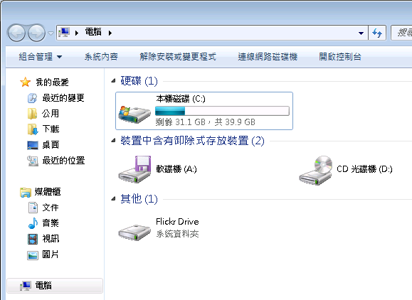 下載本軟體後直接執行即可安裝完成,並不會有任何提示訊息。完成後在「我的電腦」中會出現一台Flickr Drive,點二下{滑鼠左鍵〕即可進入。