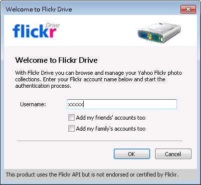 接著輸入你在Flickr的使用者名稱(也就是暱稱),接著會開啟Flickr的認證網頁,依照畫面指示完成授權動作,Flickr Drive才能正確執行。目前這套軟體並不支援中文的暱稱,請先到Flickr網站將你的暱稱改為英文才能使用。