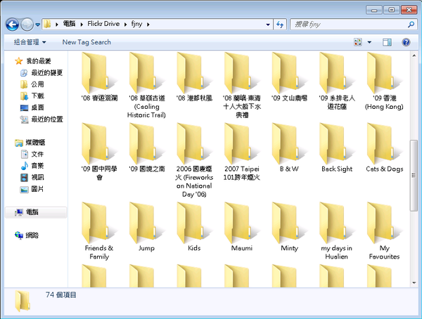 Flickr Drive提供了一個標籤搜尋的功能,能將符合某個標籤的相片全部整理到一個資料夾。按下〔滑鼠右鍵〕→【New】→【Tag Search】,再輸入相片標籤(不支援中文),就會出現一個以標籤為名的資料夾。