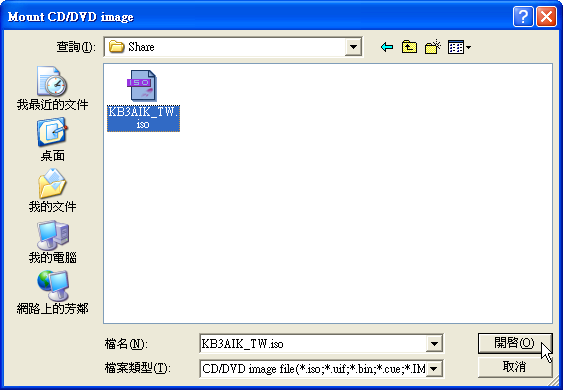 開啟「Mount CD/DVD image」對話盒後,選取「KB3AIK_TW.iso」並按下〔開啟〕。