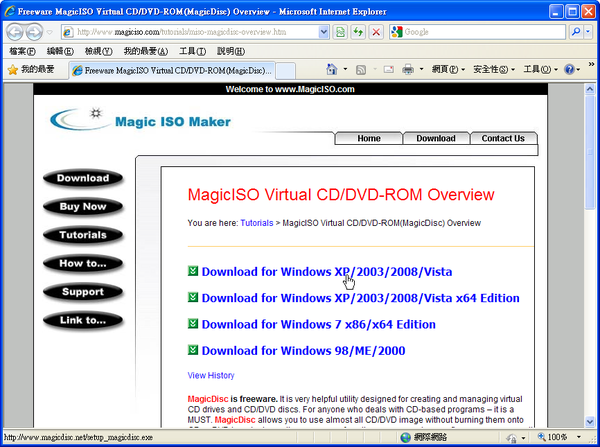 由於WAIK下載回來是光碟映像檔,並不是執行檔或壓縮檔的格式,因此我們要先將映像檔掛載起來,才能安裝它(當然讀者想直接燒成光碟安裝也是可以的)。連上「MagicDisc」這個免費的虛擬光碟軟體的官網,依照你的作業系統版本,下載對應的安裝程式。