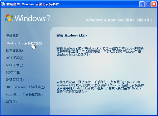 在選單上按一下「Windows AIK安裝程式」,開始安裝WAIK。