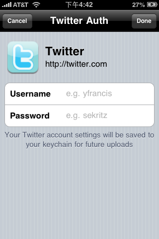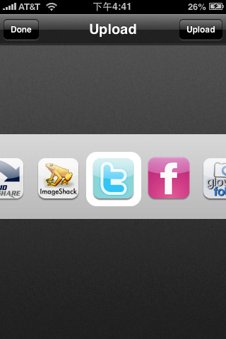 選擇想要上傳的網站:「RapidShare」、「ImageShack」、「Twitter」、「Flickr」、「Glowfoto」。選擇後按下右上角「Upload」。