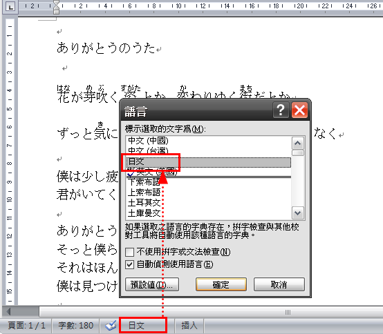 ★請注意!如果你用這個方法,結果漢字上面標示的卻是國語注音符號,而非日文平假名,這表示你貼進來的歌詞是中文編碼。只要按底下狀態列的語言選項(或功能表的【工具】→【語言】→【設定語言】),把語言改成「日文」即可。