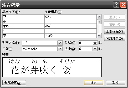 跳出如下對話盒後,會看到有漢字的地方都標上五十音了。你還可以調整五十音的文字大小和距離漢字的間隙,以免上排標示太小不好閱讀。