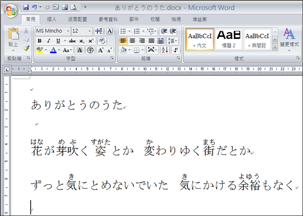 以Word 2007為例,先把日文歌詞複製到 Word 裡,將含有漢字的一段文字選取起來(一次最多只能拼30個字元),接著在上方[常用]標籤裡按下「中」鈕,也就是把選取文字標上注音符號。