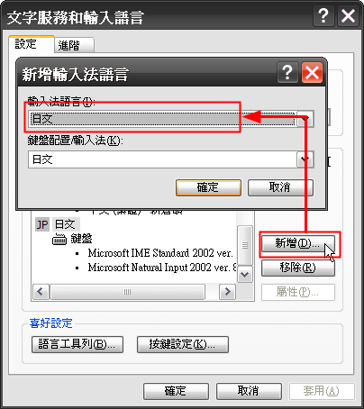 2. 在「文字服務和輸入語言」對話盒中,按下[新增]鈕,然後選擇安裝【日文】輸入法,按下[確定]後,就可以把日文輸入法新增進來了。