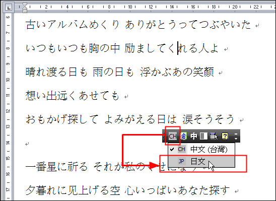 4. 再來要把輸入法切換成日文。你可以按一下輸入法工具列的「CH」,然後選擇「JP 日文」;或者按鍵盤的[Alt]+[Shift]來做切換。