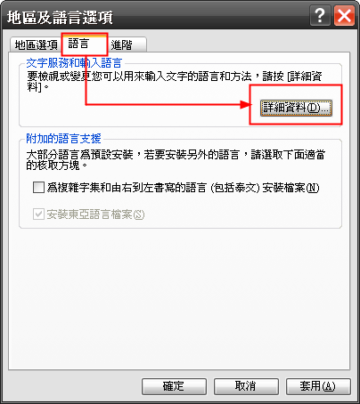 1. 想使用這招厲害的密技,你的Windows裡必須先安裝日文輸入法。在XP以上的Windows裡都有內建日文輸入法,還沒安裝的人,請先到「控制台」的「地區及語言選項」中,切換到[語言]活頁標籤,按下[詳細資料]鈕來準備新增輸入法。