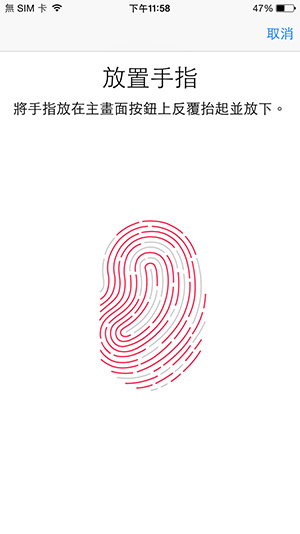 2.接著按照說明,將手指輕放在「Home鍵」上。