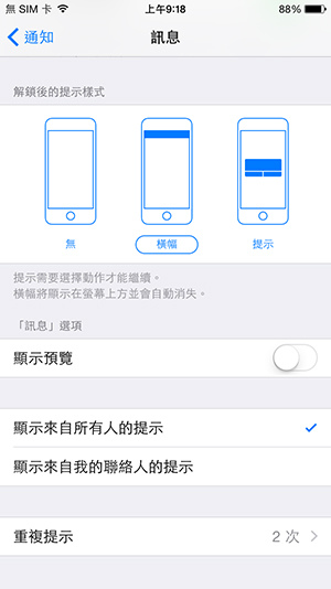 2.滑動到底下,將「顯示預覽」功能關閉,這麼一來,傳來的訊息就不會顯示任何內容了。