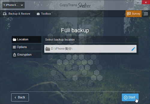 ※在備份前還可以點擊〔Option〕來更改設定,預設是「Backup apps(備份apps)」、「Keep backup history(保留備份記錄)」、「Validate backup(驗證備份正確性)」三者皆打勾。另外〔Encryption〕中則可以設定密碼保護備份檔案。