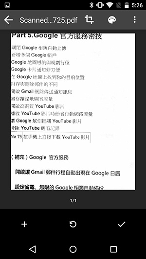 3. 拍攝好畫面後會自動轉成檔案較小的PDF文件,利用上方工具列裁剪、調整模式後,點擊下方「打勾」圖示就完成儲存了。