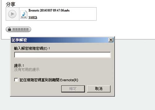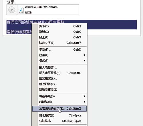 ※要注意的是,整個Evernote中用來加密文字的密碼是共通的,也就是你今天第一次使用加密文字所設定的密碼,就是以後加密其他文字時也必須使用的密碼。
