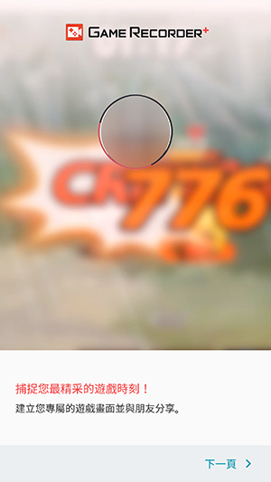 1. 啟動Game Recorder+,這時候畫面的前鏡頭會同步啟動,拍攝我們的表情,按[下一頁]同意使用相關說明,啟動功能。