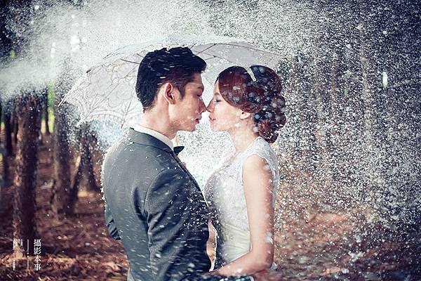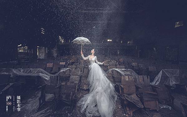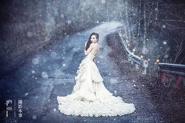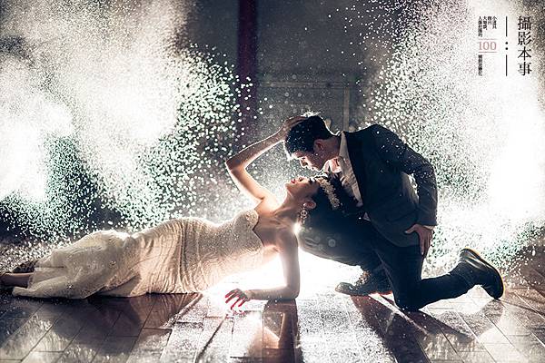 至於燈光,只要在新人身後中間擺一顆閃燈即可,出力大約1/4左右,人物前面並不需要補任何燈,因為除了雪花本身、她的婚紗都會反光,能夠補足人臉上的亮度,就不必正面再補光,否則太假。在室內的話,其實只要利用雪花本身,跟衣服與地板的反光,就能讓人物本身臉部有足夠的輪廓亮度,就很夠了。選擇讓雪花只走兩邊,就好像從地面上冒出兩個煙火的效果。