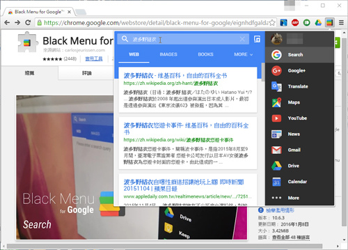 Google所提供的服務網站,雖然都會有一個類似任意門的「應用程式」選單,但項目不夠多,而且充其量也只是一個連結,還是必須開啟另一個分頁,才能使用其他的服務。如果我們安裝了「Black Menu for Google」擴充功能套件,不必開啟新分頁,就能立刻使用Google的各項服務囉!