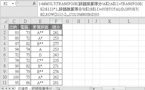 =MMULT(TRANSPOSE( 評語換算得分!A$2:A$11=TRANSPOSE(E2:E11))*1, 評語換算得分!B$2:B$11)+SUBTOTAL(9,OFFSET(B2,ROW(2:11)-2,,,COLUMNS(B:D)))