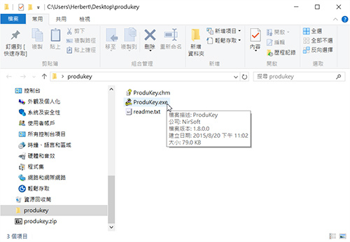 4. 將「produkey.zip」檔案解壓縮後,就會找到一個「ProduKey.exe」程式執行檔,在該執行檔案上連按兩下滑鼠左鍵。