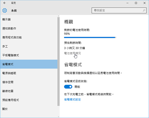 1. 先在開始功能表上點擊【設定】項目,進入設定以後,再點擊〔系統〕。進入系統以後,點擊左窗格中的【省電模式】,右窗格中即可看到電池可使用的時間,在下方省電模式滑到「開啟」來啟動,可點擊「電池使用情況」來觀看電池消耗記錄。