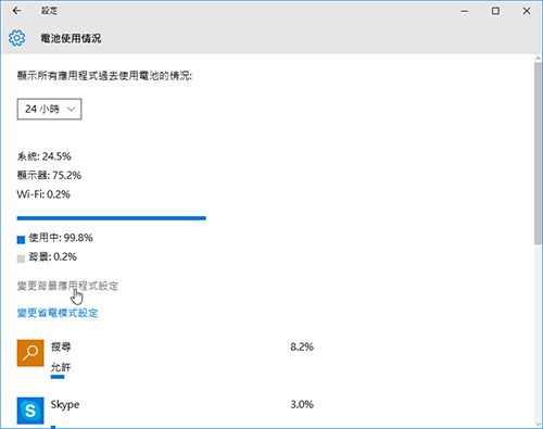 2. 進入「電池使用情況」頁面後,可以看到哪些軟體耗用最多的電量,由於有的 Windows app 在待機時不會從記憶體中被清除,因此會持續耗電,此時我們可以按下「變更背景應用程式設定」來決定是否讓這些軟體持續待機。