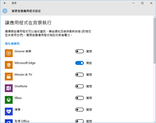 3. 進入變更背景應用程式視窗以後,可以看到此畫面中會列出電腦中所有的 Windows app,可以針對各別的 app 變更是否要讓他們留在系統背景執行。