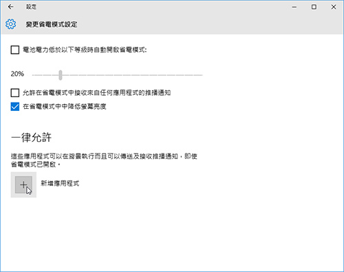 4. 接下來讓我們回到電池使用情況畫面,點擊變更省電模式設定進入,就可以變更省電模式中的細部選項,你也可以點擊「新增應用程式」來新增排除項目,讓這些 app 在待機時不會被關閉,以免收不到通知訊息。