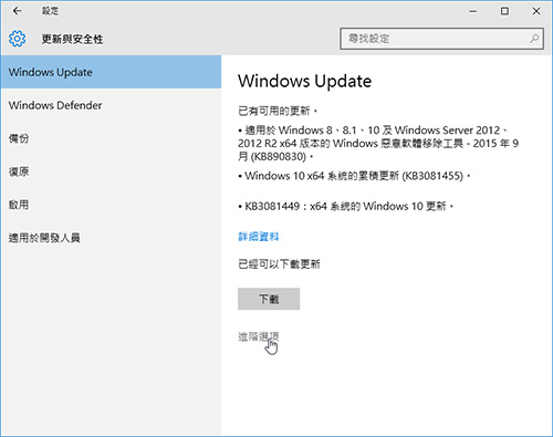 1. 點擊開始功能表上的【設定】,跳出設定畫面以後,點擊一下〔更新與安全性〕。打開「更新與安全性」視窗以後,就可以看到「Windows Update」囉!還可以在右窗格中點擊「進階選項」來設定接收與安裝更新的時間。