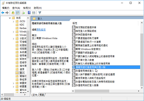3. 跳出「本機群組原則編輯器」視窗以後,在左窗格中點擊「電腦設定」→「系統管理範本」→「系統」→「登入」,然後在右側的功能區找到「隱藏快速切換使用者的進入點」,按兩下滑鼠左鍵進入。