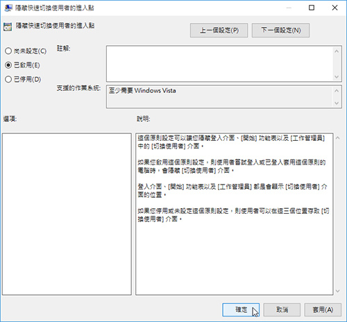 4. 「隱藏快速切換使用者的進入點」視窗跳出後,先點選「已啟用」,表示要將帳戶快速切換隱藏起來,然後按下〔確定〕就可以了。當然,要是點選「已停用」則是會顯示快速切換功能。