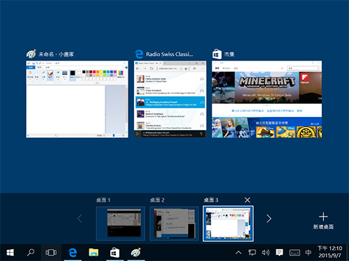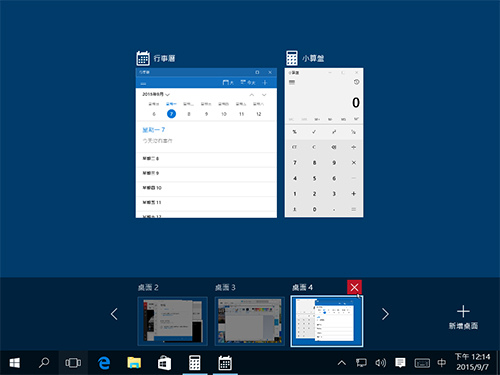 3. 若想要關閉某個虛擬桌面,只要按一下該虛擬桌面縮圖右上角的〔X〕關閉即可。也可以按鍵盤上的[開始程式集]+[Ctrl]+[F4]熱鍵來直接關閉,每按一次就會關閉一個虛擬桌面,最後只會保留一個桌面。