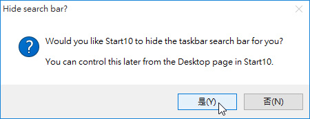 5. 在第一次開啟 Start10 時,會詢問你是否要隱藏工作列上的搜尋欄位,請依本身需求點擊〔是〕或〔否〕。