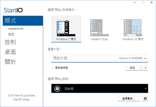 6. 開啟 Start10 可設定成 Windows 7 / Modern Style(Windows 8)/ Windows 10 模式,也能調整其他細部設定。
