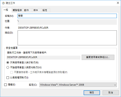 4. 此時會跳出一個「建立工作」視窗,先在「名稱」右側空白欄位內為此次的工作項目命名,然後切換至〔觸發程序〕活頁標籤。