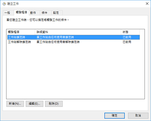 8. 回到〔觸發程序〕活頁標籤,中間欄位內就有工作站鎖定時與解除鎖定時的兩筆設定。再切換到〔動作〕活頁標籤,進一步做細部設定。