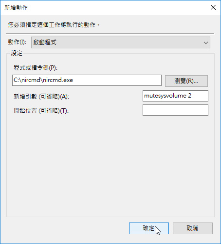 10. 「新增動作」視窗出現後,切換至「C:\nircmd」內,先點擊其中的「nircmd.exe」執行檔,再按下〔開啟〕按鈕。回到「新增動作」對話盒,「程式或指令碼」欄位內就會指定好「C:\nircmd\nircmd.exe」路徑, 接下來要在「新增引數(可省略)」右側欄位內設定讓電腦靜音的引數, 在此輸入「mutesysvolume 2」,按下〔確定〕完成設定。