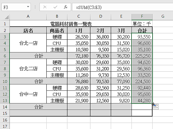 3.在Number1文字方塊中指定加總區域C3:E3,按一下〔確定〕按鈕。用公式SUM(C3:E3)計算出硬碟的銷售總和