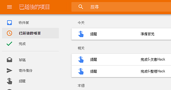 更進一步的,在接下來的其他提案中,會提到Google Inbox可以延後處理郵件,把目前還不需要處理的任務,延後到需要他的時間或地點提醒,就像是一個時間管理軟體一樣。