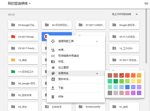 2.在行事曆中可以幫重要日曆行程上色,在Google Drive中也可以利用類似的方法來突顯出「重要資料夾」的地位,例如把重要的資料夾都改成紅色,或是幫少數特殊資料夾加上你自己覺得最容易辨識的色彩,只要在資料夾上點擊右鍵選擇「變更顏色」即可。這樣一來,當我進行檔案處理時,就能一眼認出最特殊的常用資料夾在哪裡,例如儲存常用行政文件的資料夾在哪裡。