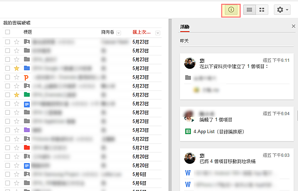 在Google Drive檔案總管右方可以顯示即時的文件編輯活動動態,讓你看到你自己,或是你與合作者從最近每一個時間點的文件編輯動態。