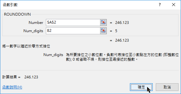 2.按一下該按鈕,在打開的“插入函數”對話盒中選擇ROUNDDOWN函數。指定儲存格後,按F4鍵,變為絕對引用