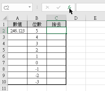 按照各種位數對數值“246.123”進行捨入。位元數為負數時,由於是在整數第n位元向下捨入,所以求得的值和原數值的誤差很大。