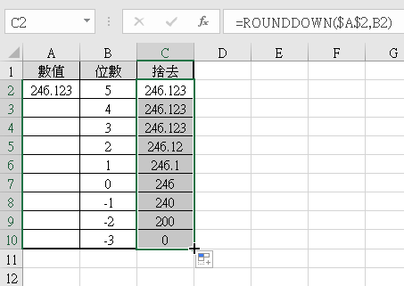 4.根據ROUNDDOWN函數,求出C2單元格內向下捨入的數值,並複製到其他儲存格進行絕對引用