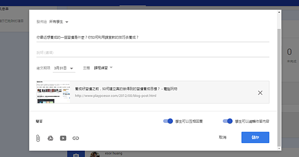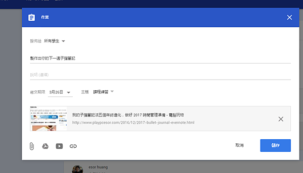 4.建立好線上教學內容後,還可以利用「Google Classroom(Google雲端教室)」來建立線上[作業],讓學生可以繳交作業。在建立課程作業的功能中,一樣可以添加文字說明,或是插入影片、檔案等等,告知學生應該繳交什麼作業,並且可以「設定繳交作業的期限」。