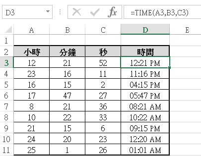 4.用公式=TIME(A3,B3,C3)將輸入在各個儲存格內的時、分、秒作為序列值,用時間格式顯示